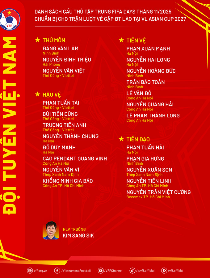 Đội tuyển bóng đá quốc gia Việt Nam vừa công bố danh sách 23 cầu thủ chuẩn bị cho trận đấu gặp đội tuyển Lào tại lượt về vòng loại cuối Asian Cup 2027. Huấn luyện viên trưởng Kim Sang Sik đã chính thức triệu tập các cầu thủ và dự kiến đội sẽ tập trung vào ngày 10/11 tại Việt Trì, tỉnh Phú Thọ trước khi di chuyển sang Lào vào ngày 15/11. Danh sách lần này gây chú ý với sự xuất hiện trở lại của tiền đạo kỳ cựu Nguyễn Xuân Son sau gần một năm ngừng thi đấu để hồi phục chấn thương, đồng thời có hai gương mặt trẻ lần đầu được gọi lên tuyển.